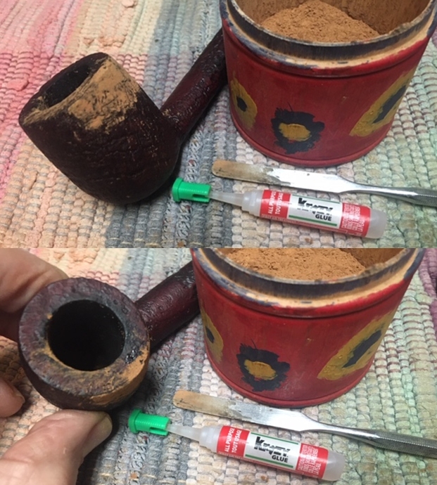 To begin my part of the restoration work I decided to repair the large chip/nick in the lower left side of the bowl. It was clean so I wiped it lightly and filled it in with briar dust and super glue.