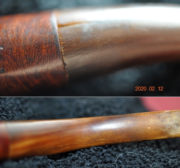 The next photos reveal the well-used condition of the horn stem. It was very dry and had a crack at the shank/stem junction as seen in the first photo. The second photo shows a long view of the stem and you can see the striations of the horn on the underside. The final two photos below show the chewed end of the stem just ahead of the button. On the top side of the stem there is a hole all the way through to the airway below. There is quite a bit of damage to the stem that will need to be addressed.