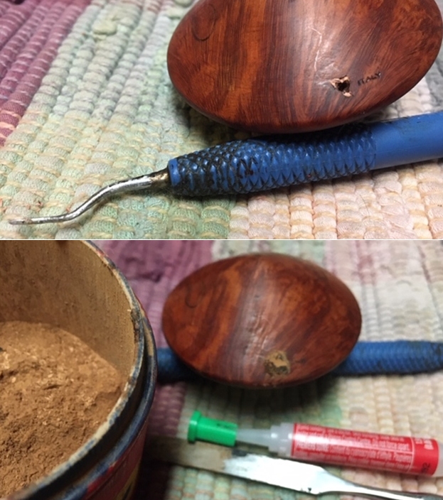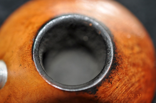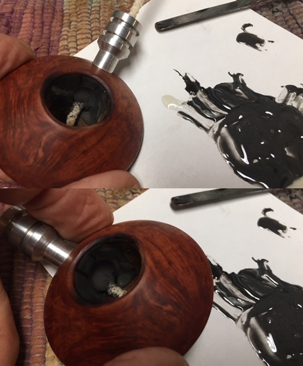 Now it was time to look at it up close and personal. Jeff had done an amazing job in removing all of the cake and the thick lava on the rim top. He had reamed the bowl with a PipNet Pipe Reamer and cleaned up the remnants with a Savinelli Fitsall Pipe Knife. He took the cake back to bare briar so we could check the walls for damage. He scrubbed the exterior of the bowl with Murphy’s Oil Soap and a tooth brush to remove the grime on the bowl and rim and was able to remove the lava and dirt. He cleaned out the interior of the bowl and shank with pipe cleaners, cotton swabs and alcohol until they came out clean. The rim top looked amazing when you compare it with what it looked like before he started. He cleaned the stem with Soft Scrub to remove the grime on the exterior and cleaned out the airway with alcohol, cotton swabs and pipe cleaners. I took some photos of the pipe as I saw it. To show how clean the rim top and stem really was I took a close-up photo of the rim and stem. The bowl was clean and cake free. The rim top is very clean with no residual lava in the sandblast finish. The inner edges of the rim show some darkening on the right and the left side. The black vulcanite stem looks cleaned up nicely. The surface had some light tooth marks but the button edge looked really good.I took photos of the stamping on the under side of the bowl. They are literally all around the bowl bottom. You can see that from the photos below. I removed the stem from the bowl and took photos of the parts. The “plumbing” on this pipe is quite unique. Look at the stinger apparatus that extends through the aluminum shank.Now it was time to start addressing issues with this pipe. I sanded the exterior of the bowl with 1500 grit micromesh sanding pads to remove the peeling varnish from the bowl. I worked on the rim edge a bit and paused as I examined the cavernous entry of airway into the bowl. It was badly burned and enlarged. I wonder if the metal stinger tip heated too much and burned the surrounding airway. I took two photos to try to capture the large cavernous opening.As I examined the area I had very few choices in terms of addressing the issue. I could carve and insert briar, glue it in place and hope that the burnout would not reoccur. The other option would be to build up the area with some JB Weld which dries inert and is basically burn proof and would preserve the airway area from further damage. I chose to use the JB Weld repair. I mixed a batch of the resin and hardener and inserted a Vaseline greased pipe cleaner in the airway so as not to close it off during the repair.I applied the mixture to the surface area around the pipe cleaner with a dental spatula. I pressed it into the cavernous pit. I knew that I would need to do this several times as it was a deep pit. I gave the first coat to the wall of the bowl and set the bowl aside overnight.This morning I filled in a few spots where the repair shrunk as it cured. The entrance to the bowl is now the size of a pipe cleaner. Once it has cured I will sand it smooth and even out the back of the bowl. I set the bowl aside and had some lunch!Once the repair had hardened to touch I worked on the underside of the bowl. There was a large pink fill next to the Italy stamp. It was damaged and hard so I picked it out with a dental pick and cleaned up the edges until all of it was gone. I wiped it out with a cotton swab and alcohol and then filled it in with a mix of clear super glue and briar dust. I know that Dal mixes the two into a putty and presses them in place. I have never succeeded in getting his putty mixture as it always hardens to quickly. Instead I layer the mix into the area to be filled. I start with glue, then briar dust pressed in with a dental spatula, then another layer of glue and some more dust. I finish it with a top layer of glue and let it dry.Once the repair has cured I used a needle file to flatten it as much as possible to the surface of the briar. I followed up by sanding it with a small corner of folded 220 grit sandpaper to blend it into the surrounding briar. Once it was smooth I buffed it lightly with 1500 grit micromesh and then stained it with  an Oak Stain pen to blend it into the bowl. At this point in the process I set the bowl aside for awhile to let the bowl cure some more and turned my attention to the stem. The first issue with the stem was the fact that it was under-turned almost a quarter turn. I removed the stem and heated the metal stinger with the flame of a Bic lighter. The heat softens the glue holding the stinger in the stem. After a few minutes I screwed the stem back in the shank and corrected the under-turned stem. Once I had it aligned I set it aside and let it cool off while in place.I moved on to addressing the remaining oxidation on the stem and the tooth chatter and marks. I sanded out the tooth marks on both sides of the stem with a folded piece of 220 sandpaper and sanded out the remaining oxidation. I started polishing with 400 grit wet dry sandpaper. I rubbed the stem down with Denicare Mouthpiece Polish – a red gritty paste a lot like Tripoli to polish it after the 400 grit sandpaper. I rub it on with my fingertips and work it into the vulcanite and buff it off with a cloth. It does a great job before I polish it further with the micromesh pads.I polished the stem with micromesh sanding pads – dry sanding with 1500-12000 grit sanding pads. I wiped the stem down after each sanding pad with a cloth containing some Obsidian Oil. I finished polishing it with Before & After Pipe Stem Polish – both Fine and Extra Fine and buffed it off with a cotton cloth. I gave it a final rub down with Briarville’s No Oxy Oil to preserve and protect the vulcanite stem. I set the stem aside and went back to work on the bowl. The bowl looked very good so I did not need to do any further work on it. I rubbed the bowl and shank down with Before & After Restoration Balm to deep clean the finish on the bo