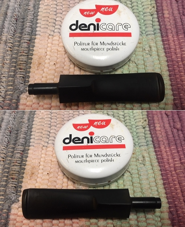 I started polishing the stem with Denicare Mouthpiece Polish – a red gritty paste that feels a lot like tripoli. I find that it works well to polish out some of the more surface scratches in the vulcanite left behind by the 400 grit wet dry sandpaper. I rub it into the stem surface with my fingertips and buff it off with a cotton pad.
