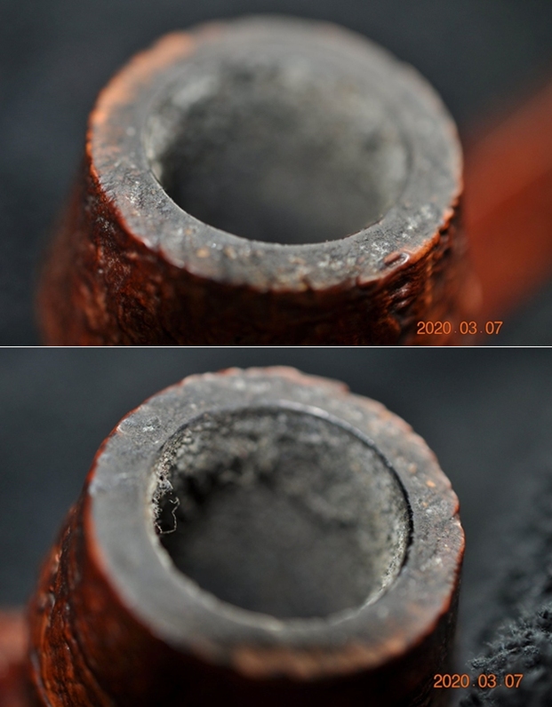 He took close-up photos of the bowl and rim top from various angles to capture the condition of the bowl and rim top edges. You can see the lava overflow and debris in the sandblasted rim top. You can see the cake in the bowl. This was a dirty pipe but it was the overall finish appeared to be in good condition.