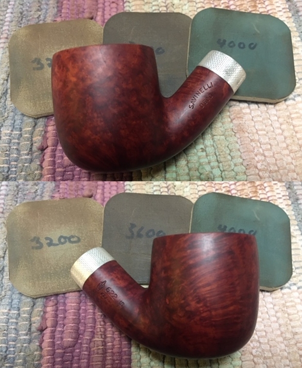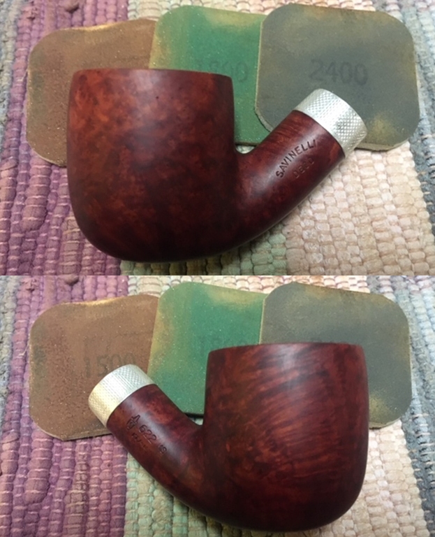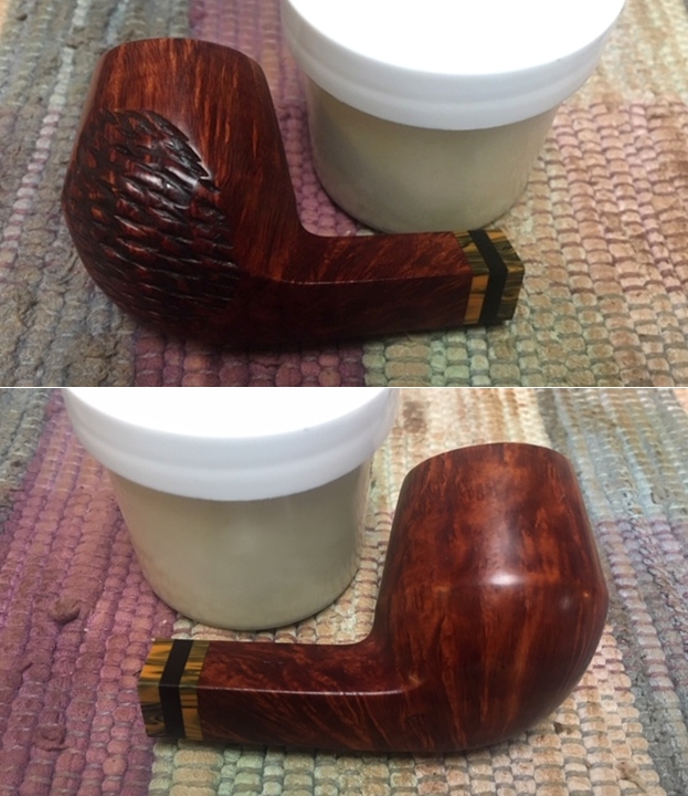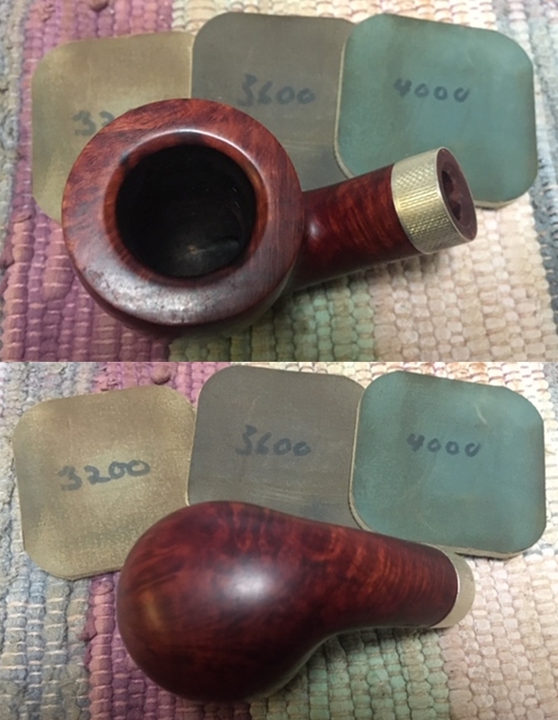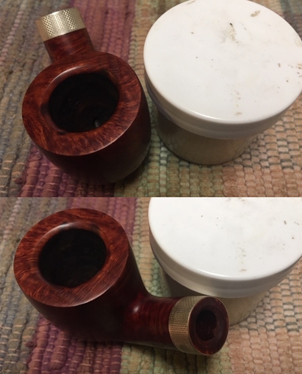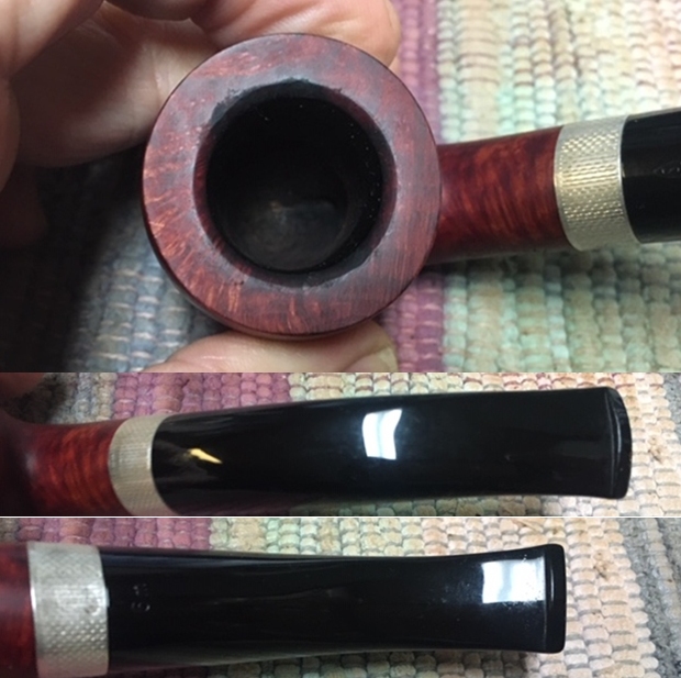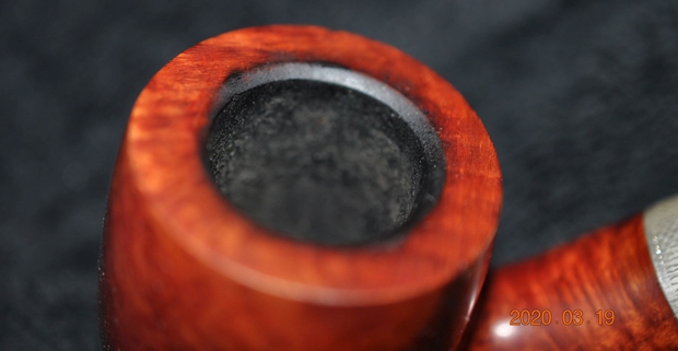 The photos of the rim top and bowl show the thick cake, tobacco debris and slight lava overflow on the rim top. The pipe was messy but the finish looked good.