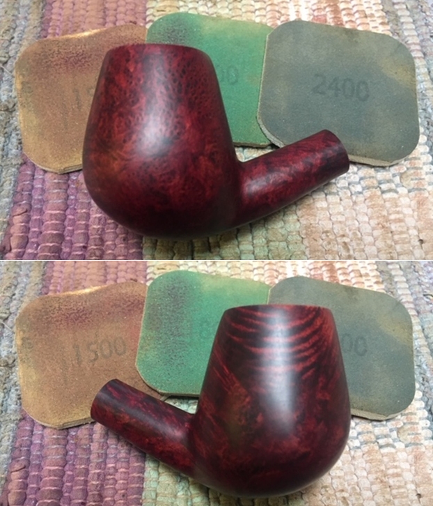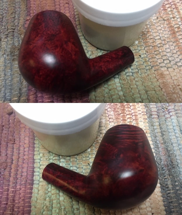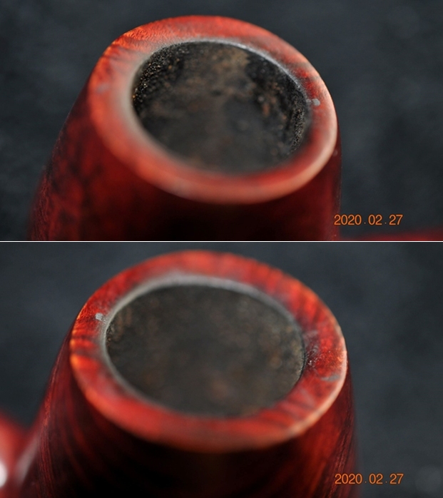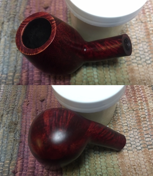 The photos of the rim top and bowl show the thick cake, tobacco debris and slight lava overflow on the rim top. The pipe was messy but the finish looked good.