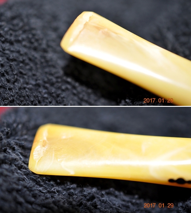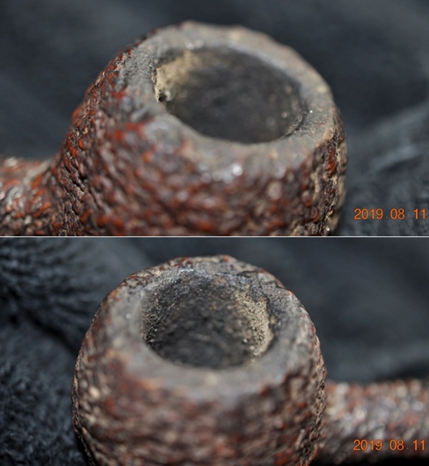 I took photos of the bowl and rim top as well as the stem to show how clean they were. You can the roughness on the top and the inner edge of the rim on the front right side of the bowl. The bowl and rim looks much better without the thick lava and cake. The stem looked better. There are tooth chatter and marks on both sides of the stem near the button.