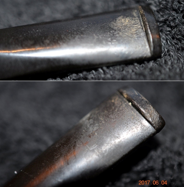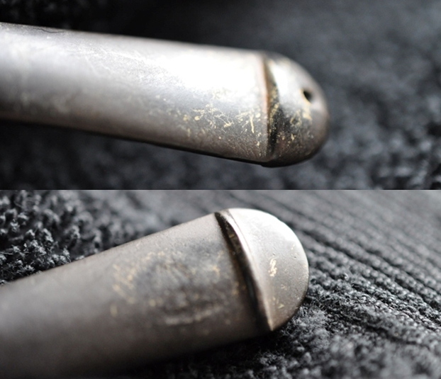 The next two photos show the condition of the stem. You can see that it is lightly oxidized and has some tooth chatter and marks on both sides near the button. There is also some wear on the button surfaces on both sides.