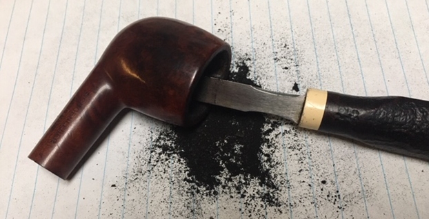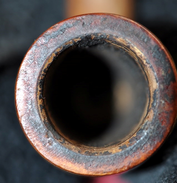 I decided to start my work on the pipe by dealing with what looked like checking and damage on the inner walls of the bowl on the back side above the entrance of the airway into the bowl. I poked at it with dental pick and was pretty sure I was dealing with cracks in the cake rather than deep into the walls. I sanded the walls smooth with a dowel wrapped in 220 grit sandpaper. Once I sanded it the damage was a lot less.