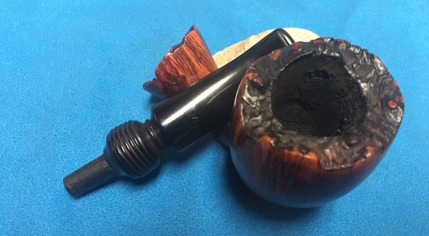 I set the bowl aside and turned my attention to replacing the tenon. I had a threaded tenon that I had started turning down to size for another pipe that would work perfectly. It is shown in the photo below next to the broken chunk of the original tenon. I would need to use a Dremel and sanding drum to finish turning the tenon portion down to match the diameter of the broken one. I would also need to reduce the diameter of the threaded tenon end because of the size of the end of the stem.