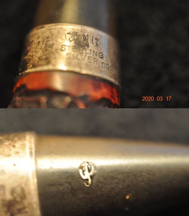 The stamping on the underside of the shank read as noted above. The photo shows that they are very clear and readable. The stamping on the silver is also readable. The P on the left side of the stem is in good condition.