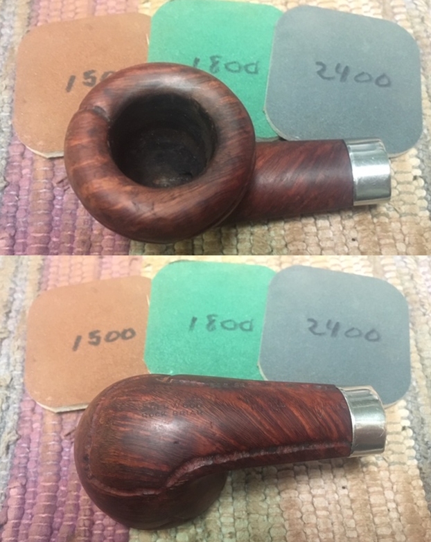 I decided to start my work on the pipe by addressing the darkening on the rim top and the inner edge. I used a folded piece of 220 grit sandpaper to work on the edge to remove the darkening. It took a bit of work but I was able to remove the majority of it and the end product looked much better. I did not sand the rim top as I figured that polishing it with micromesh pads would take care of the rim top for me.
