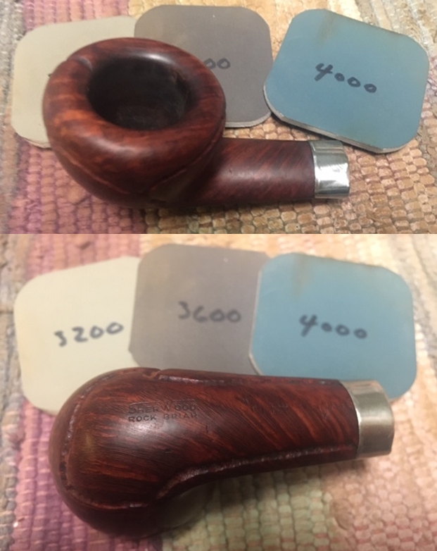 From what I could find there were several things about the pipe on my table that did not add up to what I was seeing in the various photos. I found a picture of the same pipe on Worthpoint (https://www.worthpoint.com/worthopedia/wow-savinelli-sherwood-rock-briar-143136918). It has a long slender tapered stem on the shank and no band. I was pretty certain before I saw this picture that the pipe I was working on had a replacement stem – it was a saddle stem and was poorly fit to the shank. I was also confident that the band was for a cracked shank repair and was not original. It also covered the stamped KS portion of the shape number. I think both were added at the same time to repair a break that happened which cracked the shank and broke the stem. The photos I was seeing confirmed my suspicions about the pipe in hand.