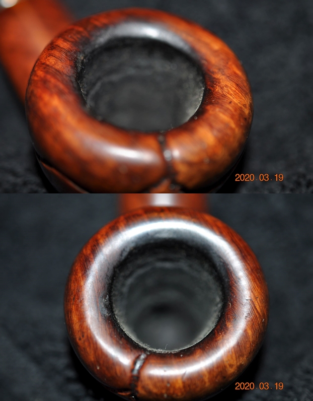 Armed with that information and a clearer picture of the original pipe I turned to work on the pipe on my work table. Jeff had done a great job cleaning up the pipe as usual. He reamed the pipe with a PipNet reamer and cut back the cake back to the bare briar. He cleaned up the walls with a Savinelli Fitsall Pipe Knife. He scrubbed the interior of the bowl and shank with pipe cleaners, cotton swabs and alcohol to remove the tars and oils. He scrubbed the exterior of the pipe with Murphy’s Oil Soap and a tooth brush to remove the grime from the finish. He worked on the rim top lava and darkening with the soap and tooth brush. He scrubbed the inside of the stem with alcohol and pipe cleaners. He scrubbed the exterior with Soft Scrub and then soaked it in Before & After Deoxidizer. He washed it off with warm water to remove the deoxidizer. The pipe looked far better. I took photos of the pipe when I received it before I started working on it.