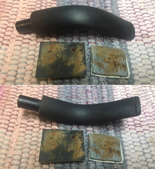 I set the bowl aside and turned my attention to the stem. I “painted” the tooth marks on the top and underside to lift the vulcanite. It actually worked quite well. I filled in the remaining dents and built up the edges and top of the button on both sides as well using clear super glue.