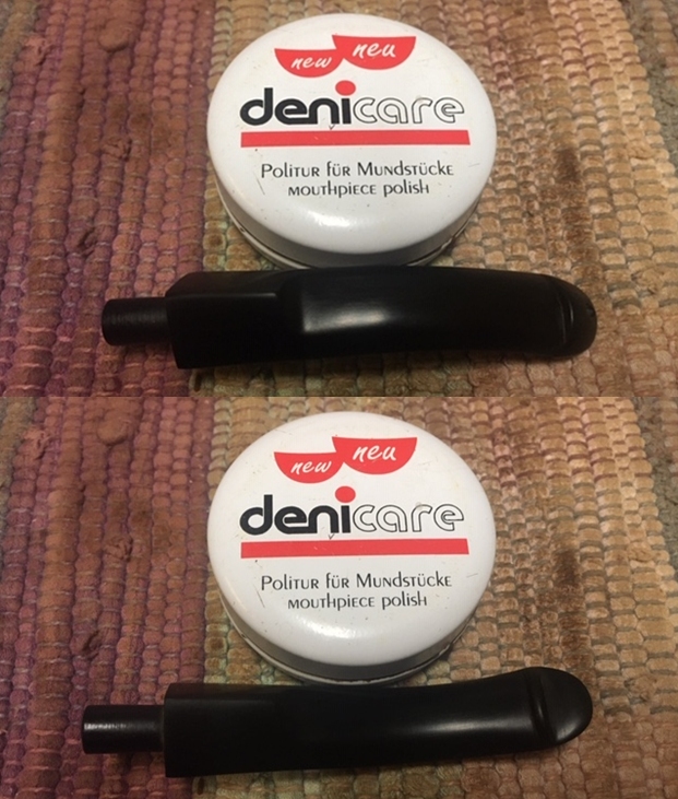 I rubbed the stem down with Denicare Mouthpiece Polish – a red, gritty Tripoli like substance that is a paste. I rubbed it into the surface of the stem and polished it off with a cotton pad. I have found that is a great intermediary step before polishing with micromesh pads. I am not sure what I will use once the final tin I have is gone!