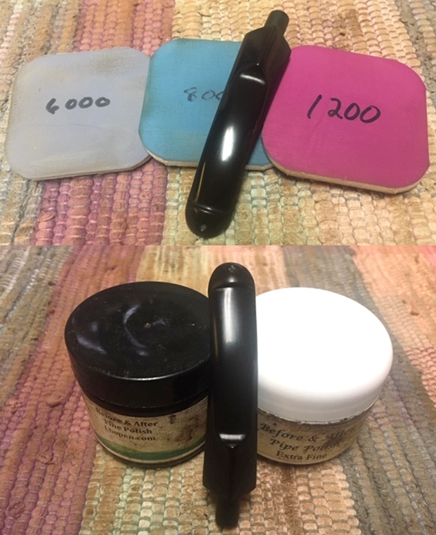 I polished the stem with micromesh sanding pads – 1500-12000 grit pads. I wiped it down with Obsidian Oil after each sanding pad. I used Before & After Pipe Polish – both Fine and Extra Fine to further polish the stem.