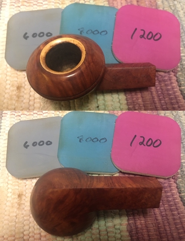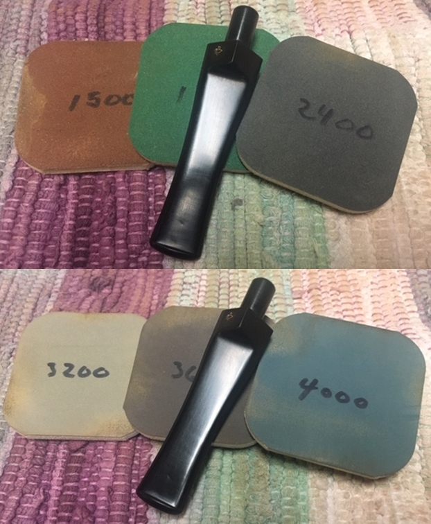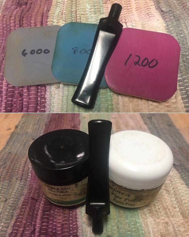 I polished the vulcanite with micromesh sanding pads – 1500-12000 grit pads. I wiped it down with Obsidian Oil after each sanding pad. I used Before & After Pipe Polish – both Fine and Extra Fine to further polish the stem.