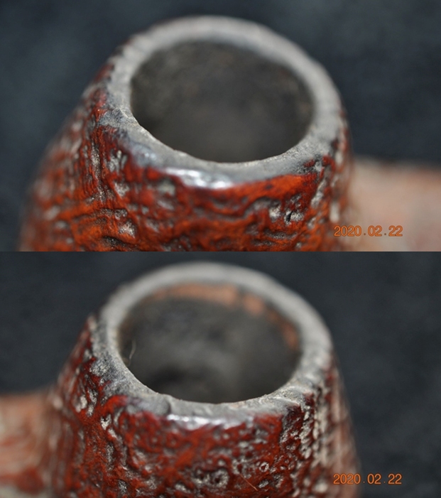The chamber is so filled with cake that I am unable to reach the bottom of the bowl with my little finger. The build-up of the cake is heavier on the bottom half of the bowl, but overall well maintained. The condition of the inner walls of the chamber can be commented upon after the cake has been taken down to the bare briar. The rim top is thin and has the same shallow sandblast surface as the rest of the stummel, has darkened and is covered with dust, lava and grime. I don’t think that there is any charring to either of the rim edges and they appear to be in pristine condition. The chamber odors are not very strong and should be completely eliminated once the cake has been removed and the shank has been thoroughly cleaned.