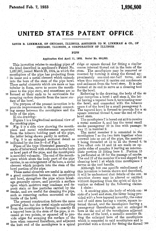 The M. Linkman and Co. was established by Louis B. Linkman and August Fisher in 1898. The company closed down in the 1950s and the Dr Grabow branch was sold to Henry Leonard and Thomas Inc. Early Linkman’s pipes were stamped MLC in an oval.
