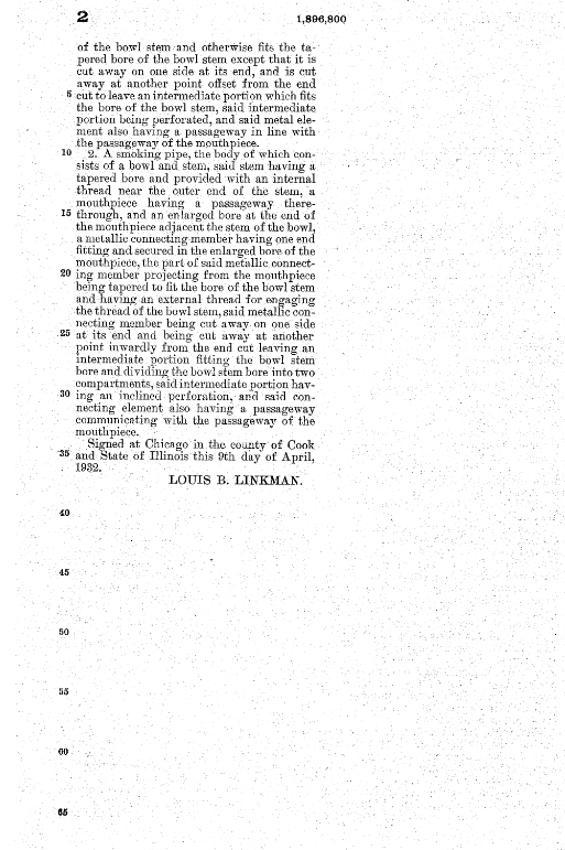 I then did a patent search on the US Government Patent site using the patent number on the underside of the shank. I found the following Patent information. It specifically refers to the stinger apparatus that is attached to the tenon. It was filed in April 11, 1932 by L.B. Linkman. I am including the full patent information below.