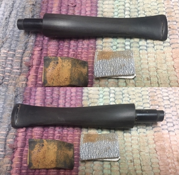 I sanded the stem with 220 grit sandpaper to finish the shaping and to remove the remaining oxidation. I started polishing the stem with 400 grit wet dry sandpaper. I wiped the stem down with Obsidian Oil before further polishing it.