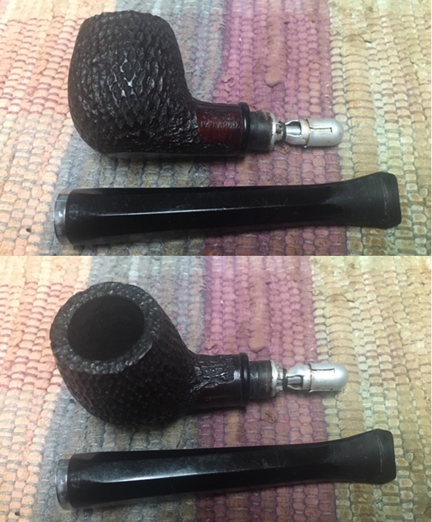 I have a small but growing sub-collection of Patent and Patent Applied For pipes. All of them have the same purpose – to provide a perfect smoke. All of them have a variety of internal plumbing to filter and cool a smoke. The concept was that the moisture and heat of the smoke was collected on various surfaces and contraptions in the stem or shank and a cooler smoke flows through the mouthpiece to the smoker. This is yet another of those interesting pieces that came out made a small splash and soon disappeared into the shadows of the past. This pipe is stamped KEN on the top of the hexagon shaped stem (which in this case is an opaque red plastic). There is a smooth panel on the left side of the shank that read Ken in script over PAT. APLD. On the underside of the shank it is stamped with a large upper case hollow point A. The finish on the pipe is rusticated with a tight rustication pattern that covers the bowl, rim and shank. There is a black ring at the shank end. There was a thick cake in the bowl and lava had overflowed onto the rim top filling in the rustication. The mouthpiece was oxidized and had a lot of tooth chatter and marks on both sides that showed that the stem itself was made of red acrylic. Jeff took photos of the pipe before he cleaned it.