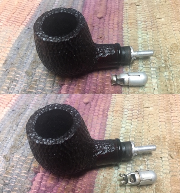 Armed with the information above I was excited to work on this system pipe that fascinated me. I turned to work on the pipe on my work table. Jeff had done a great job cleaning up the pipe as usual. He reamed the pipe with a PipNet reamer and cut back the cake back to the bare briar. He cleaned up the walls with a Savinelli Fitsall Pipe Knife. He scrubbed the interior of the bowl and shank with pipe cleaners, cotton swabs and alcohol to remove the tars and oils. He scrubbed the exterior of the pipe with Murphy’s Oil Soap and a tooth brush to remove the grime from the finish. He worked on the rim edge lava and darkening with the soap and tooth brush. He scrubbed the inside of the stem with alcohol and pipe cleaners. He scrubbed the exterior with Soft Scrub. He washed it off with warm water to remove the cleaner. The pipe looked far better. I took photos of the pipe when I received it before I started working on it.