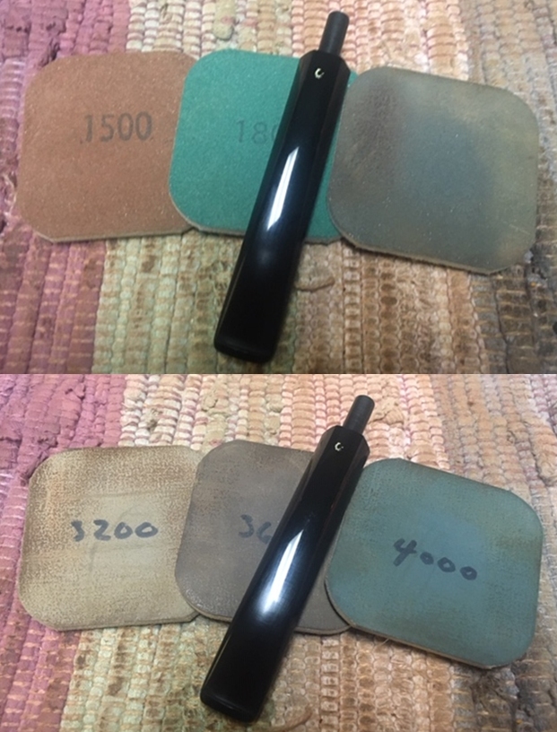 I sanded the stem with 220 grit sandpaper to remove the small tooth chatter and marks near the button. I started polishing the stem with 400 grit wet dry sandpaper. I wiped the stem down with Obsidian Oil before further polishing it.