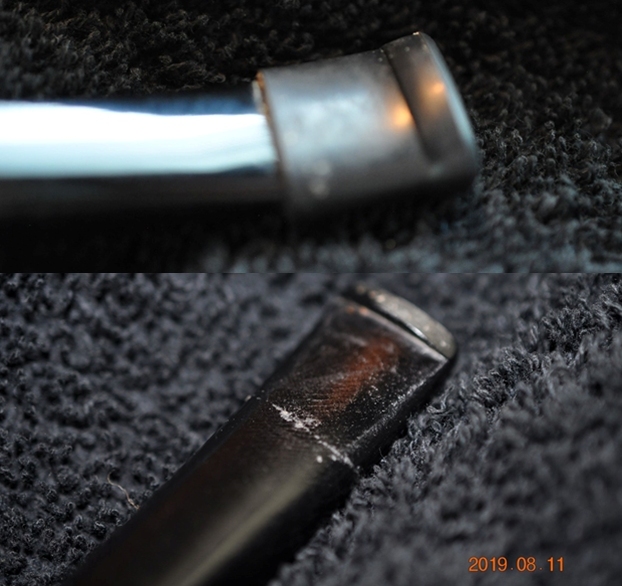 The acrylic stem was dirty and had debris stuck to the surface. In the first photo of each pair below you can see the rubber Softee bit on the stem and in the second photo of each pair it is removed. The bit did a good job of protecting the stem surface from the majority of tooth damage but even so there are light spots on the surface that will need to be removed.