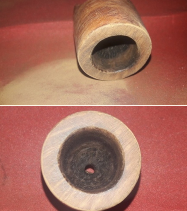I decided to work on the tenon first. I examined it with a bright light and a lens and could see that it had originally been glued in place in the stem. What I was not sure of at this point was whether it was a push tenon or a threaded one. I used a pair of needle nose pliers to check the connection. It did not wiggle like a push tenon and it turned so I had my answer – a threaded tenon. I unscrewed it from the shank and took a photo.
