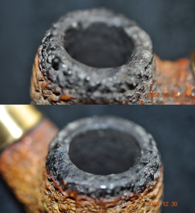 To get a better understanding of the condition of the meerschaum lining, I wiped the walls of the chamber with isopropyl alcohol on a cotton swab. Now the extent of repairs required is amply evident. The entire lower meerschaum lining on the left half of the chamber has broken down in a jagged manner and the same is marked with yellow arrows. The fourth picture gives out a very clear idea of the break in the lining and the thickness of the lining that needs to be repaired. Also the hardened lava overflow over the rim top is clearly discernible. This issue needs to be addressed first.