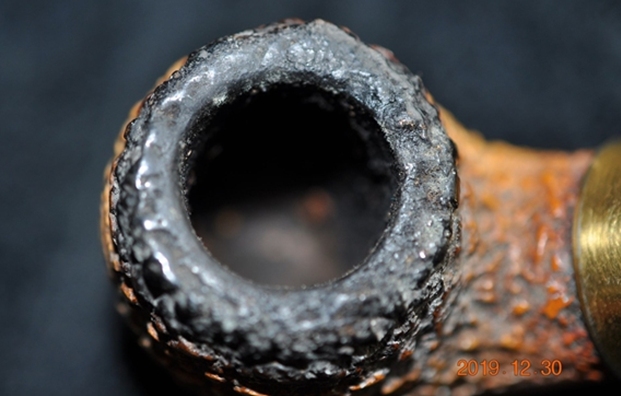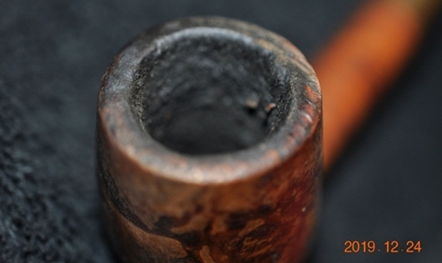With my fabricated sharp edged knife, I gently scrapped and dislodged the complete mound of overflowed lava from all around the rim top surface. After the lava overflow has been removed, the damage to the rim top is now clearly visible. The meerschaum lining is uneven and has been completely blackened due to absorbing all the oils and tars from such heavy usage.