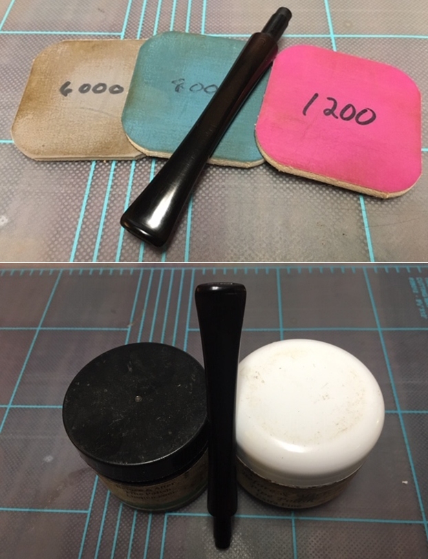Staying with the stem restoration, I polished the stem surface with micromesh pads, wet sanding with 1500 to 12000 pads. I wiped the surface with a soft cloth at the end of the micromesh cycle. The rim top surface looks nice with a deep shine. I applied a little Extra Virgin Olive oil to the stem, though it does not help much, and set it aside. Though I am not a big fan of acrylic stems, I am happy with the way the stem appears at this stage.