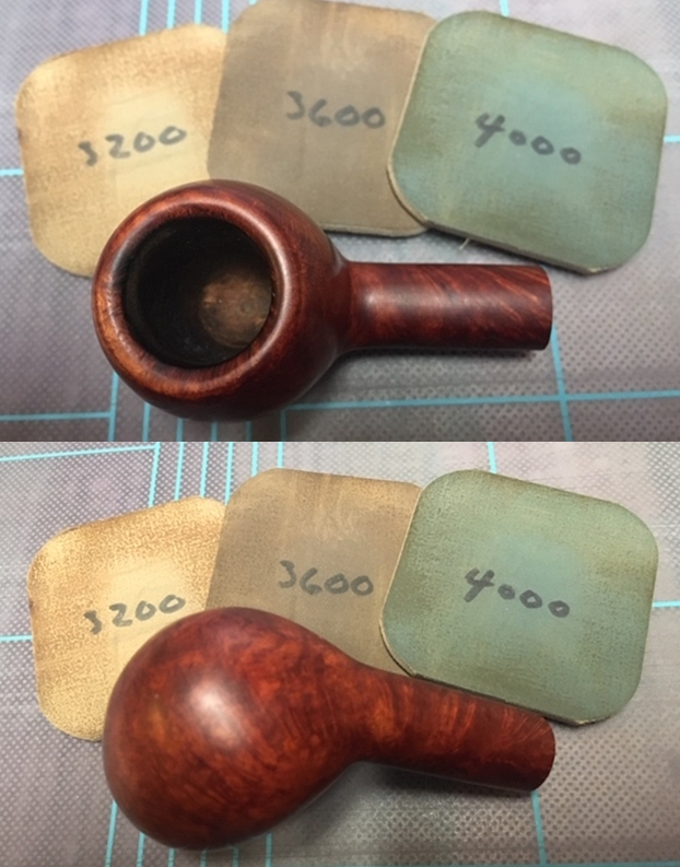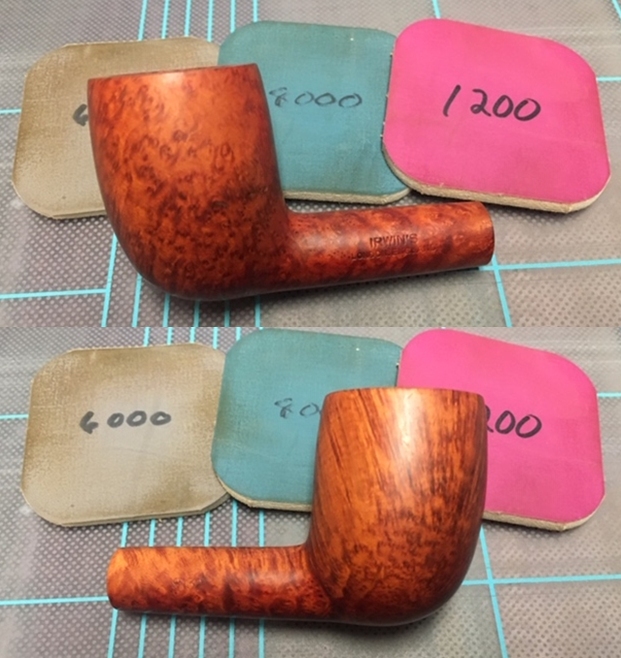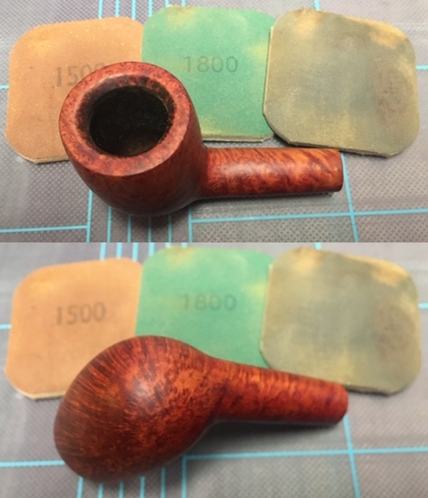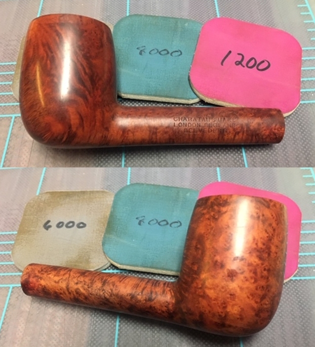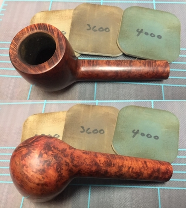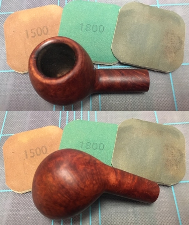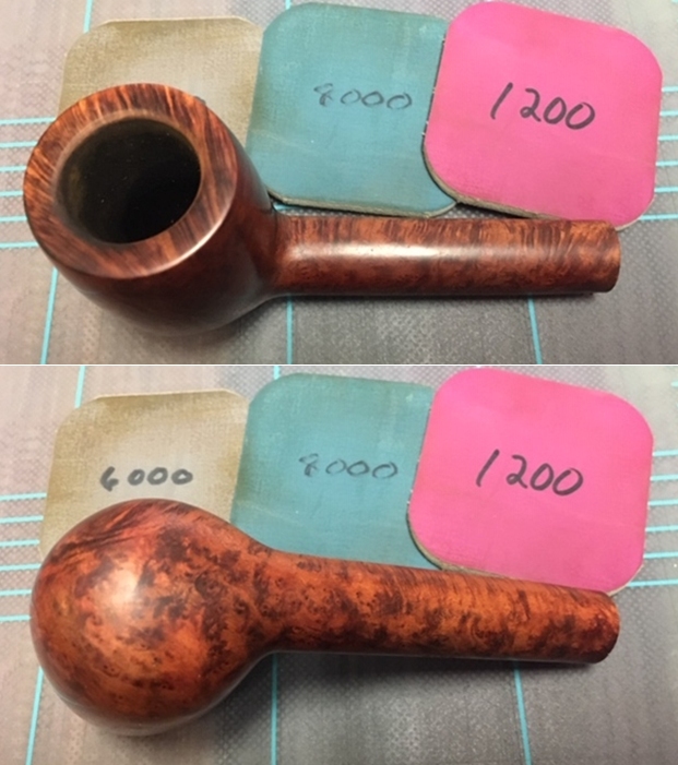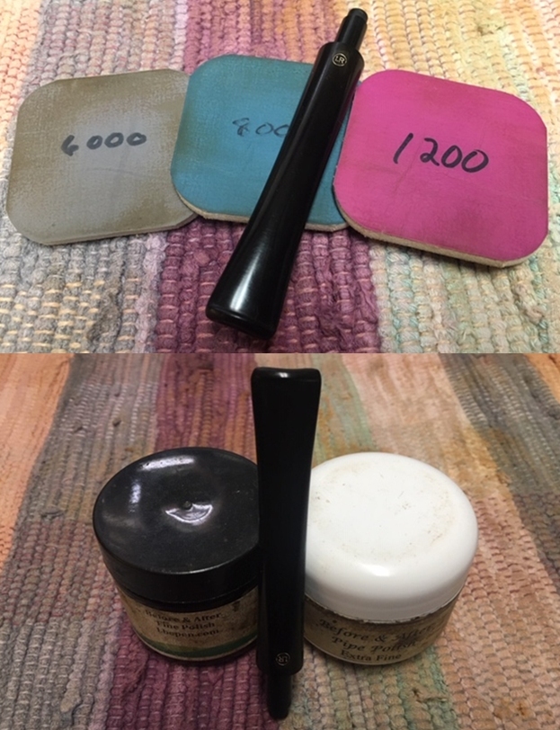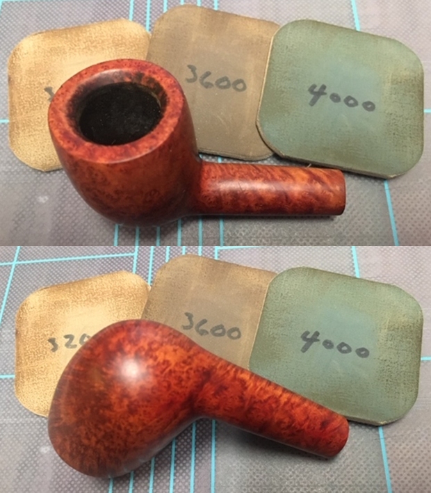 I polished the briar with micromesh sanding pads – wet sanding with 1500-12000 grit pads and wiping the briar down with a damp cloth after each sanding pad.
