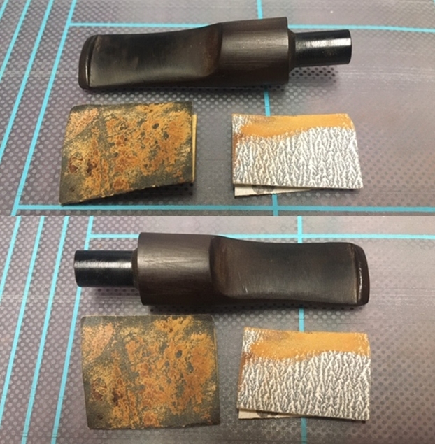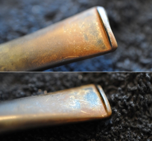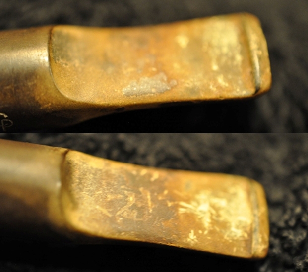 Jeff took photos of the top and underside of the stem showing the tooth chatter, scratching and oxidation on the stem surface and wear on the edges of the button.