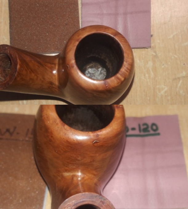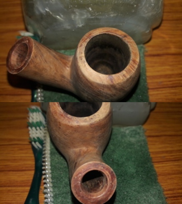 While the stem was soaking in the deoxidizer solution, I worked on the stummel by first reaming the chamber with size 2 Castleford reamer head. I further scraped the chamber walls with my fabricated knife to remove the remaining carbon deposits where the reamer head could not reach. I scraped out the lava overflow from the rim top surface. Once the cake was reamed back to the bare briar, I used a 150 grit sand paper followed by 220 grit sand paper to remove all the traces of remaining cake and also to smooth out the inner walls of the chamber surface. Finally, to remove the residual carbon dust, I wiped the chamber with a cotton pad wetted with 99.9% pure isopropyl alcohol. And it was at this stage that I got the first (and hopefully the last) inkling of the likely damage to the heel of the chamber. The mortise and draught hole had been over zealously cleaned with pipe cleaners/ shank brush by the previous piper and which had resulted in a deep trough from the draught hole to the center of the heel with raised edges on the sides. This trough is indicated with red arrows. If or not the damage has extended to the foot of the stummel will be confirmed once the stummel surface has been cleaned. The chamber walls, inner and outer rim edges are pristine and without any damage.