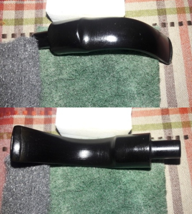 To bring a deep shine to the vulcanite stem, she polished it by wet sanding with 1500 to 2000 grit sandpapers followed by further wet sanding with 3200 to 12000 grit pads. She wiped the stem with a moist cloth after each pad and rubbed it down with Extra Virgin Olive oil to rejuvenate the vulcanite. The finished stem is shown below. I checked the fit of the stem in to the mortise of the stummel and realized that the fit is very loose. This may happen when the mortise has been cleaned of the entire accumulated gunk and the briar has dried out completely. I shall address this issue by moistening the mortise with water and if that does not work, I shall use more invasive methods.