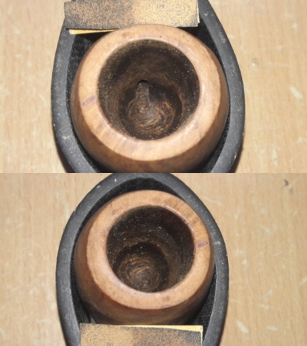 The chamber has a slight taper towards the rim top and a chamber depth of about 1 ¼ inches. The outer edge of the rim towards the shank is slightly flattened while the rest of it is perfectly rounded. The chamber has an even layer of thick hard cake with remnants of un-burnt tobacco seen at the heel of the chamber. The rim surface has light traces of lava overflow over the rim surface. Through this layer of lava, a few dings can be seen over the rim top surface. The outer rim edge is sans any damage. The condition of the inner walls of the chamber can be commented upon after the cake has been taken down to the bare briar. The ghost smells in the chamber are not very strong. The stummel appears solid to the touch all around and hence I do not foresee any serious damage to the walls in the form of burnout/ deep heat fissures/ lines or pits. The ghost smells should reduce once the cake from the chamber is removed and the shank has been cleaned.