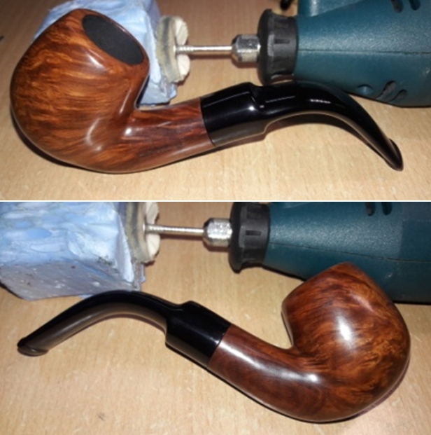 To put the finishing touches, I mount a cotton cloth buffing wheel on to my hand held rotary tool and polished the stummel and stem with Blue Diamond compound. This compound helps to remove the minor scratch marks that remain from the sanding.