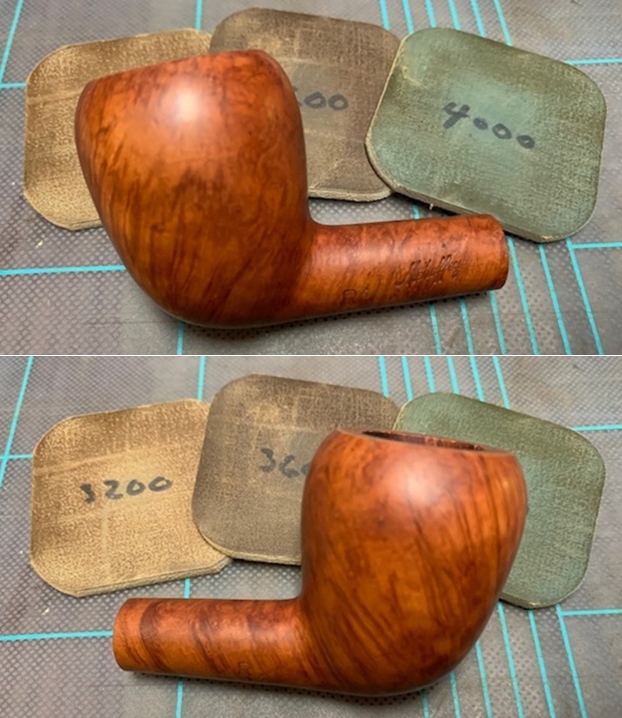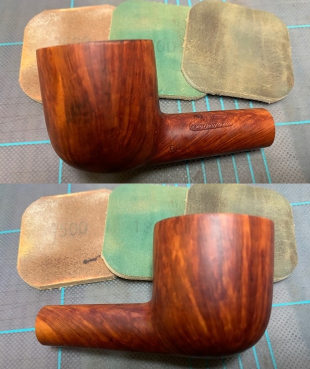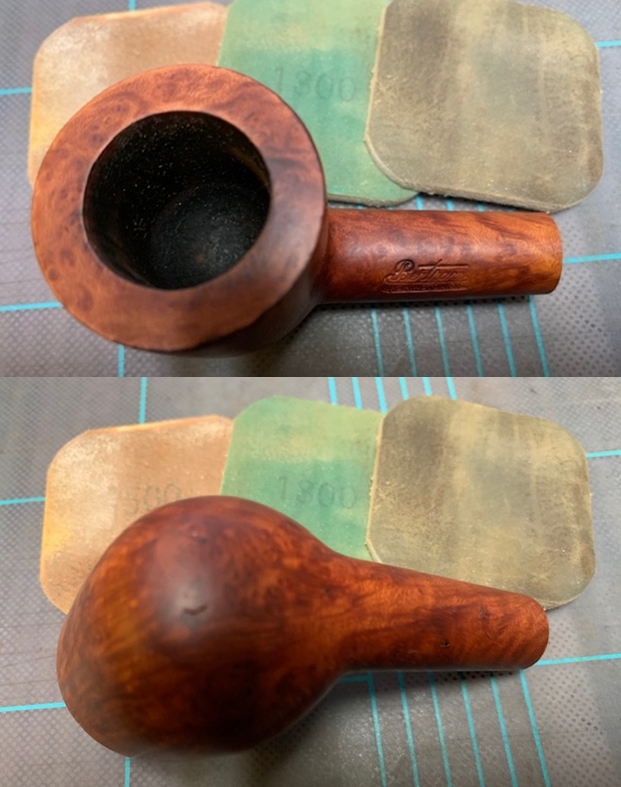 Next issue to be addressed was that of the numerous deep road rash marks that were seen to the flat lower surface of the stummel. With a folded piece of 180 followed by 600 and 800 grit sand paper, I diligently sand away the road rash marks from the lower flat surface of the stummel taking care that the stampings are preserved in total. I followed it up by polishing the surface by wet sanding with 1500 to 12000 grit micromesh pads. Though the road rash marks are not completely eliminated, they are greatly reduced. The road rash marks to the gold band are now distinctly visible in the last picture.
