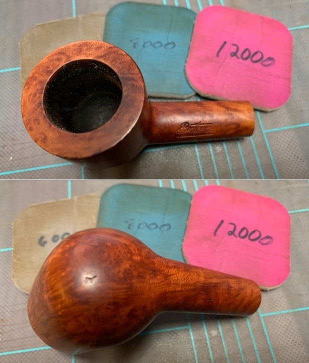 I rubbed a small quantity of “Before and After Restoration Balm” deep in to the briar with my finger tips and let it rest for a few minutes. The balm almost immediately works its magic and the briar now has a nice vibrant appearance with the beautiful grain patterns displayed in their complete splendor. I further buffed it with a horse hair brush. The dark browns of the raised portions of the sandblast contrasts beautifully with the rest of the dark stummel and makes for a visual treat. It really is a nice piece of briar.