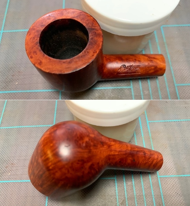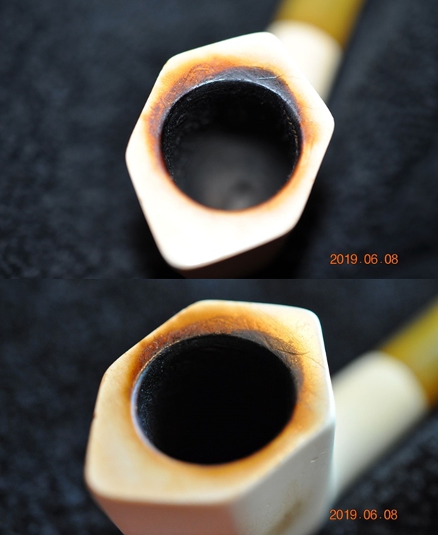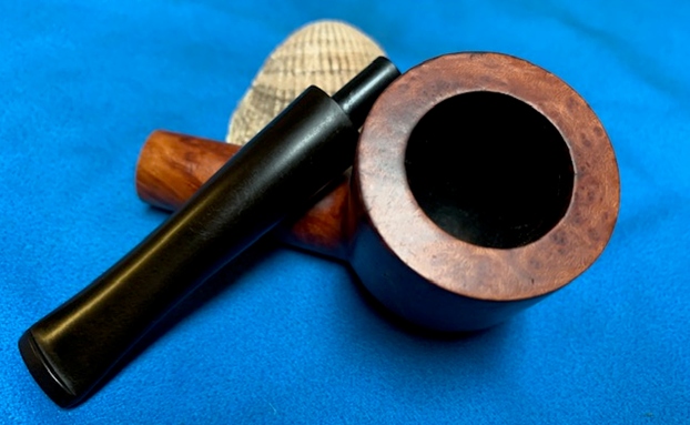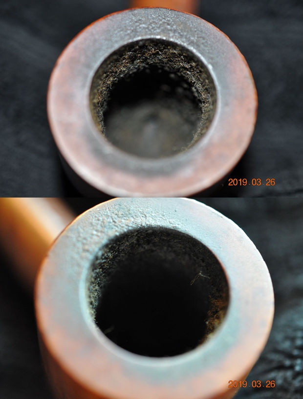 This pipe has a large bowl with a depth of 2 ¾ inch. The chamber has an even layer of thick hard cake. There is a heavy overflow of lava over the rim top surface. The rim top has darkened considerably. The condition of the inner walls of the chamber and the inner edge can be commented upon after the cake has been taken down to the bare briar. The ghost smells in the chamber are not very strong.