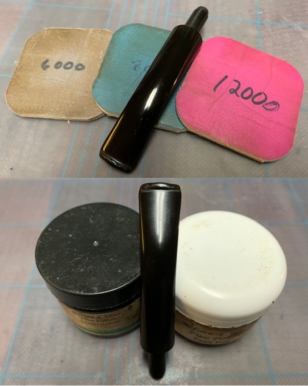 Because the oxidation was mostly on the surface and the tooth damage had been minimized I could immediately move ahead to polishing the stem. I polished the vulcanite with micromesh sanding pads – 1500-12000 grit pads. I wiped it down with a damp cloth after each sanding pad. I used Before & After Pipe Polish – both Fine and Extra Fine to further polish the stem.