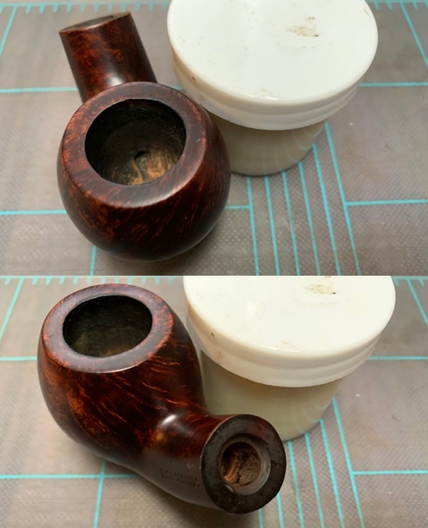 Jeff had cleaned up the pipe with his usual penchant for thoroughness. He reamed the pipe with a PipNet Pipe Reamer and cleaned up the remnants with a Savinelli Fitsall Pipe Knife. He scrubbed the bowl with undiluted Murphy’s Oil Soap with a tooth brush. He rinsed it under running warm water to remove the soap and grime. He cleaned out the inside of the shank and the airway in the stem with alcohol, cotton swabs and pipe cleaners. He soaked the stem in Before & After Deoxidizer and rinsed it off with warm water. I took photos of the pipe once I received it.