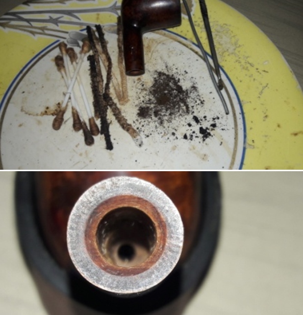 I continued the cleaning of the chamber and shank internals with a salt and alcohol bath. I use cotton balls which is an at par substitute as I have realized over the years. I draw out a wick from the cotton and along with a folded regular pipe cleaner; insert it in to the mortise and through the draught hole in to the chamber. Thereafter, I packed the chamber with cotton balls to about quarter of an inch below the inner rim edge and soaked the cotton balls with isopropyl alcohol up to the brim. About half an hour later, the level of alcohol had gone down, having being absorbed by the cotton. I topped it up once again and set it aside overnight. By next afternoon, the cotton and alcohol had drawn out all the remaining oils and tars from the chamber and mortise, fulfilling its intended task. I removed the cotton balls and ran pipe cleaners through the mortise to clean out all the loosened tars and gunk and further cleaned it with alcohol and q-tips. The chamber now smells clean and fresh.