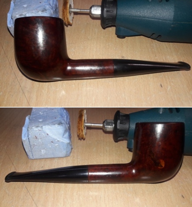 I have now reached the homestretch in this restoration project. To complete the restoration, I mount a cotton cloth buffing wheel on to my hand held rotary tool and polished the stummel and stem with Blue Diamond compound. This compound helps to remove the minor scratch marks that remain from the sanding. This too was a mistake, I feel since the stummel appears too dark with no grains visible at all!! However, the stummel and stem has taken on a nice shine.
