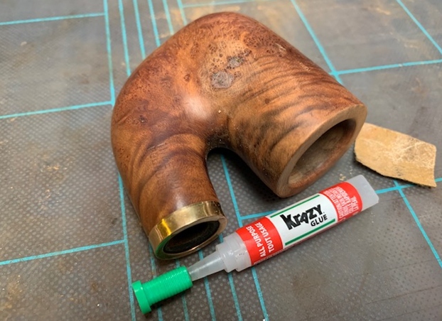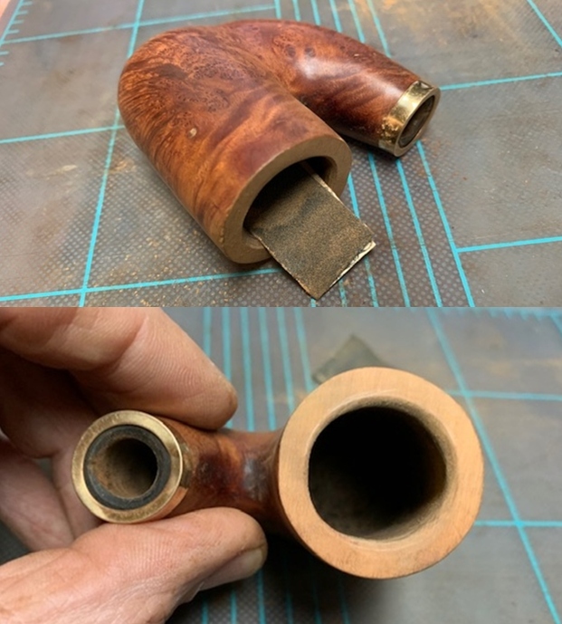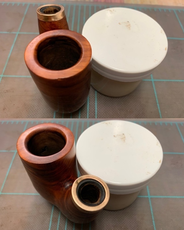 Now it was time to do my work on the pipe. You can see the pinched and reduced diameter of the shank in the photo below. I measured the diameter and figured that a brass band on the shank end that did not go too deep on the shank could take care of that pinched look.