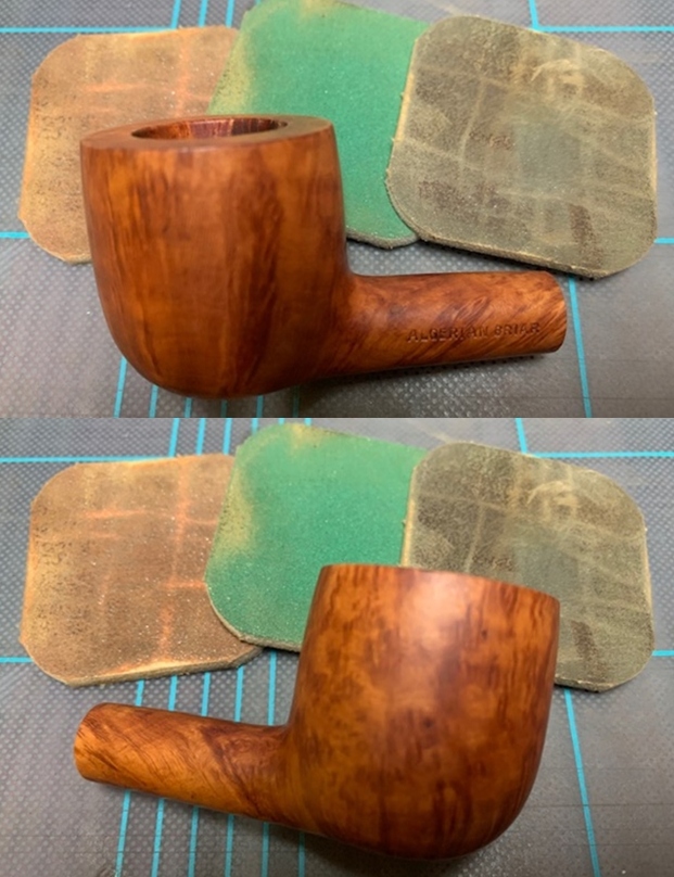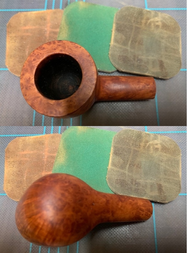 I stained the rim top with an Oak Stain pen to blend the repairs on the rim top and the heel of the bowl into the surrounding briar.