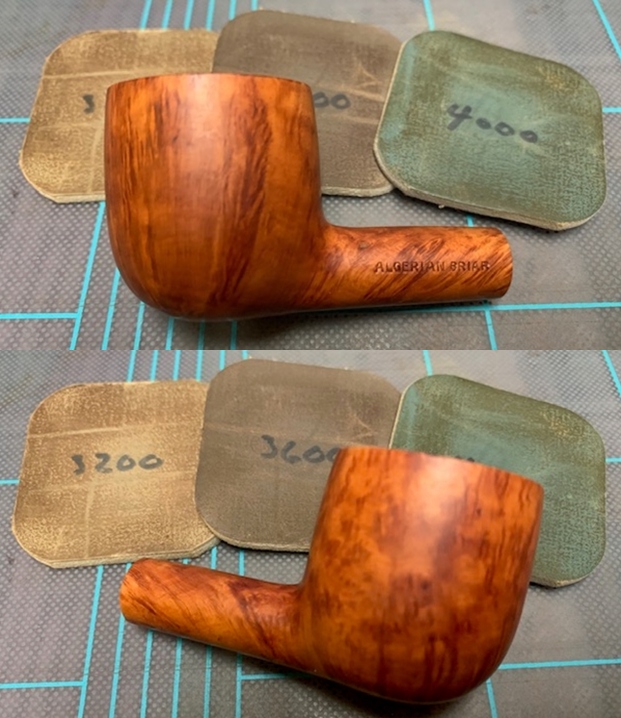 I polished the top of the bowl and the entirety of the bowl with micromesh sanding pads – wet sanding with 1500-12000 grit pads and wiping the briar down with a damp cloth after each sanding pad.