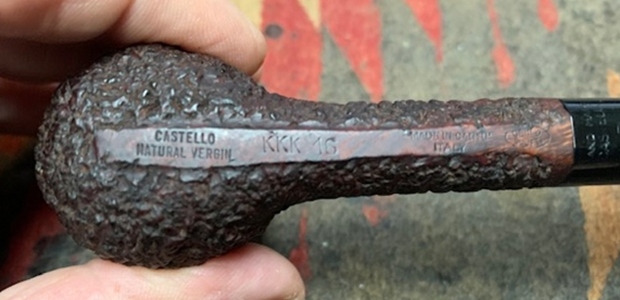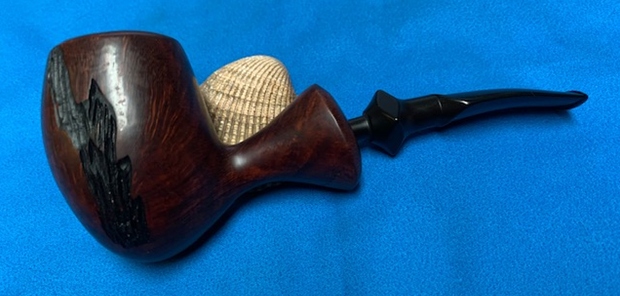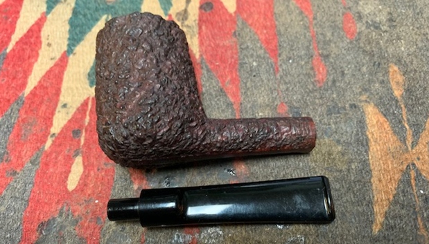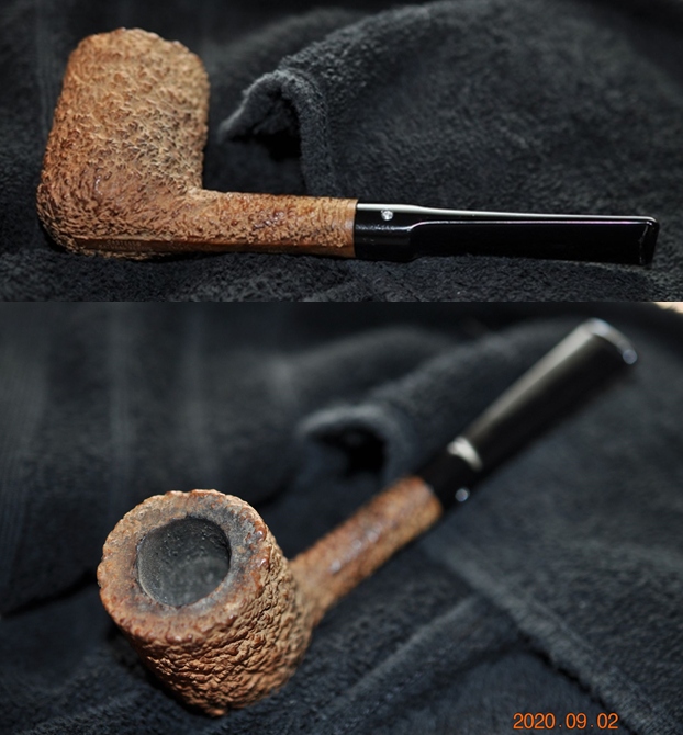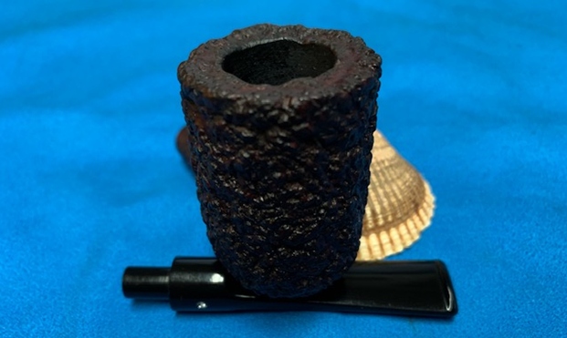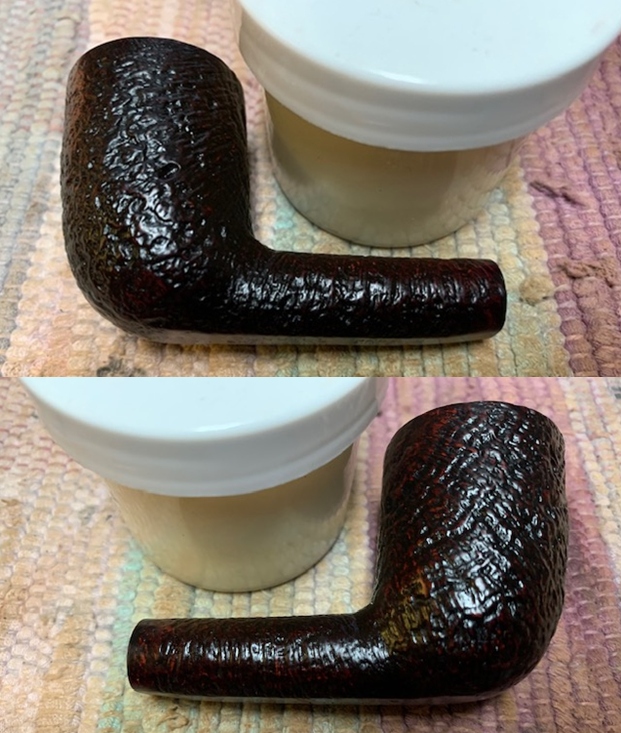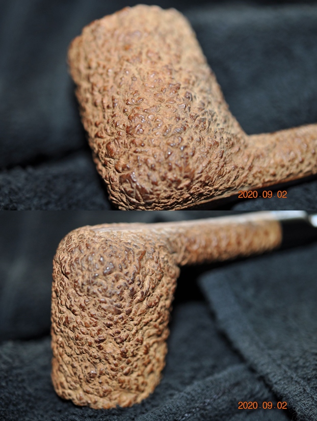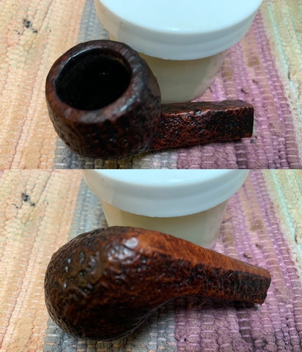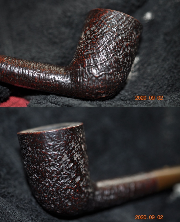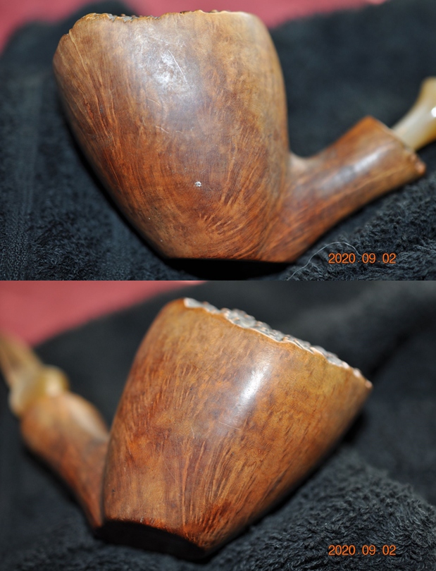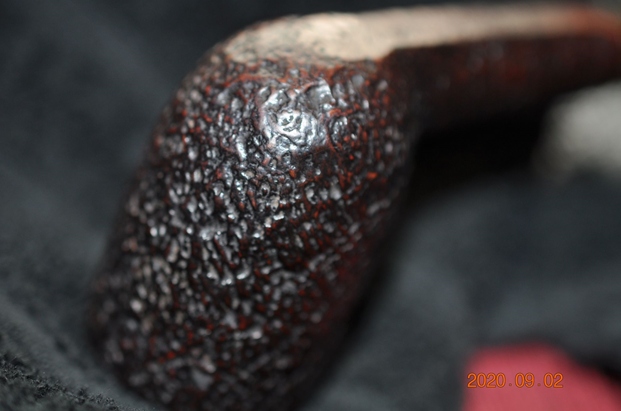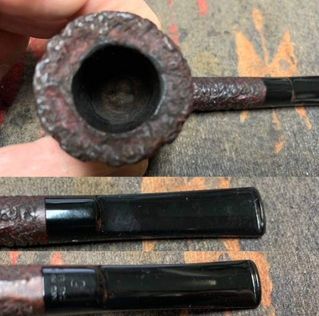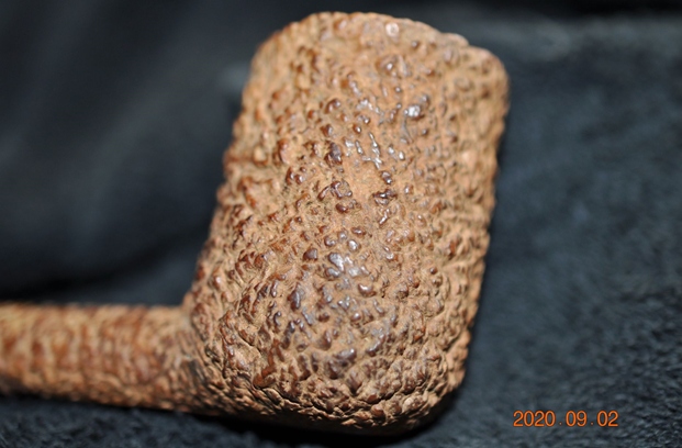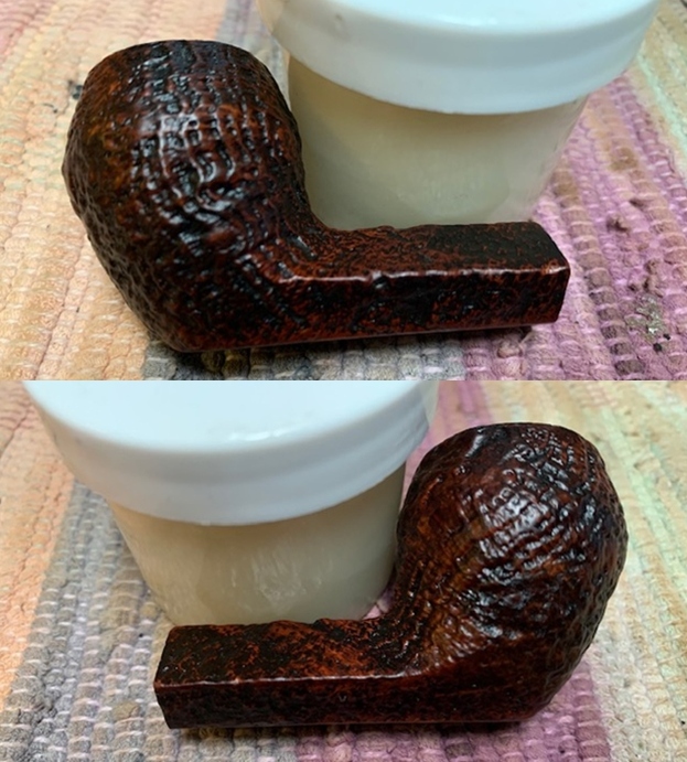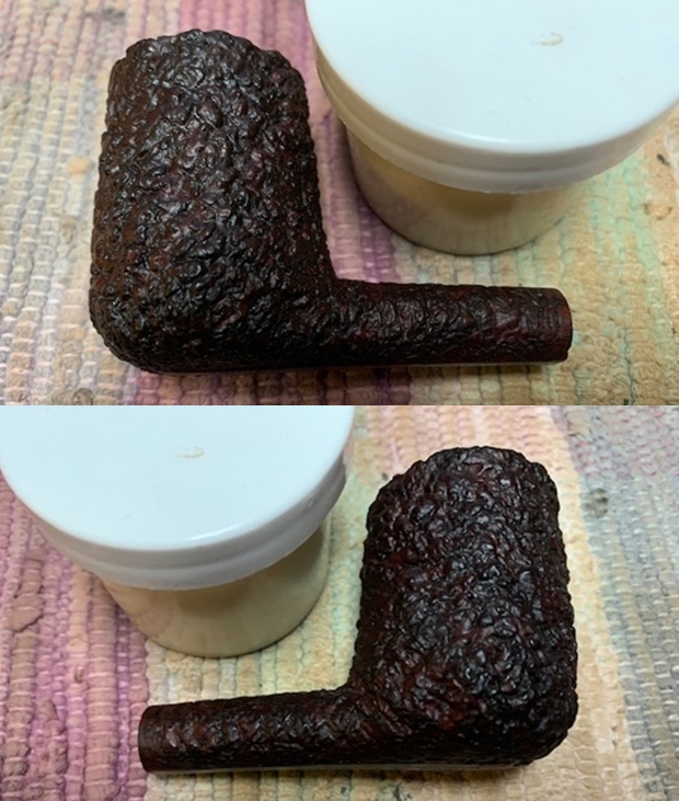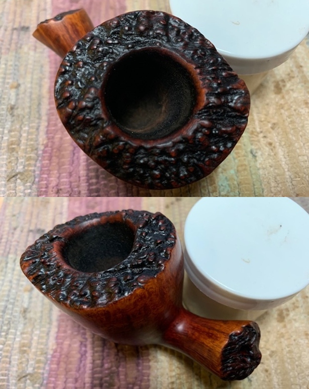 The next pipe on the table came to us from a pipe hunt Jeff and I did in Washington earlier this year. We picked this Weber Imported Briar Bowl sans stem at an Antique Mall along the way of the hunt. The rusticated finish was unique and allowed some nice flame and straight grain to come through in the smooth portions of the bowl. On the right side of the shank it was clearly stamped with the Weber oval logo [over] Imported Briar. The finish is smooth other than the rusticated or carved portion on the left side of the bowl toward the front. The rim top and first ¼ inch of the bowl side below the rim top is smooth as is the shank end. The pipe bowl was filthy with grime and oil ground into the briar of the bowl and shank sides. There was a lot of dust in the carvings on the bowl sides. The bowl had a thick cake and a thick overflow of lava on the rim top. The rim edges – both outer and inner – looked very good. Jeff took some photos of the bowl to show its overall condition and shape before he started his cleanup work.