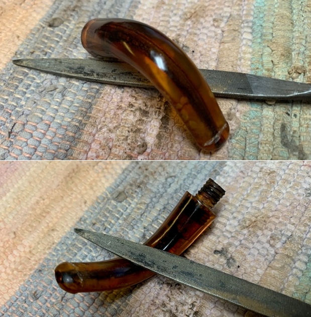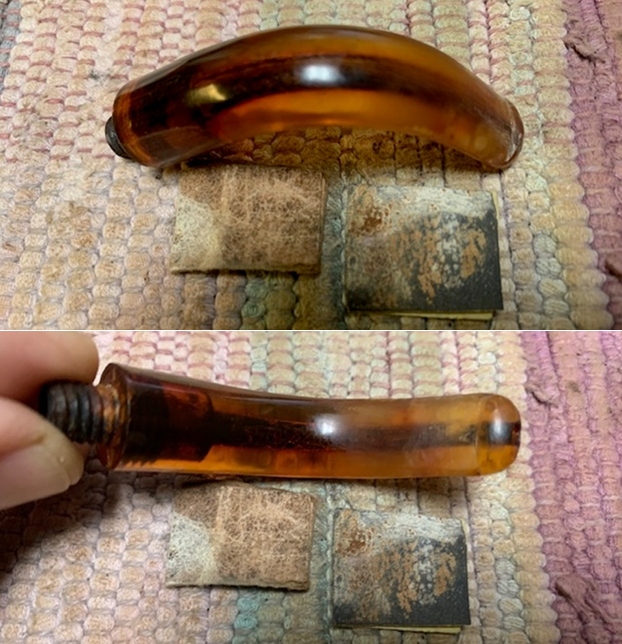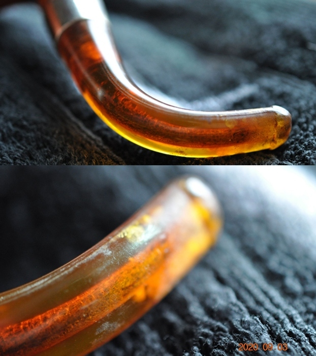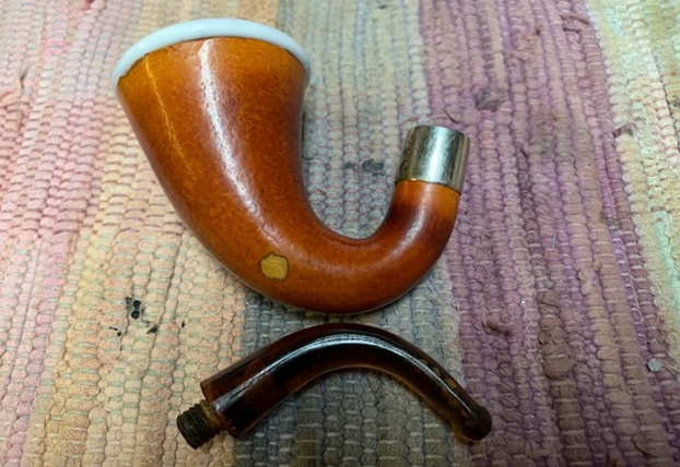 I went through my stem and chose two stems that would work with the pipe. The first one was a saddle stem. I had been drilled for a filter and was quite shiny. I was not sure if it was rubber or if it was plastic. I sanded the tenon down so that it would fit the pipe.