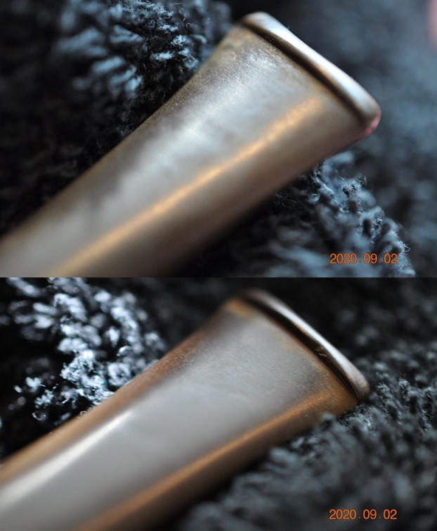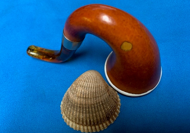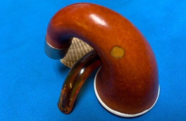I decided to put a brass shank band on the pipe because I really like the look of a thin band between the wood and the bent stem on an Oom Paul. I just sold and English made one that I had done that with and really liked the looks. It is purely cosmetic as there are no cracks. I smoothed out the shank end with 220 grit sandpaper and polished it lightly with a 1500 grit micromesh pad. I pressed the band in place on the shank end and took some photos to show how it looked.